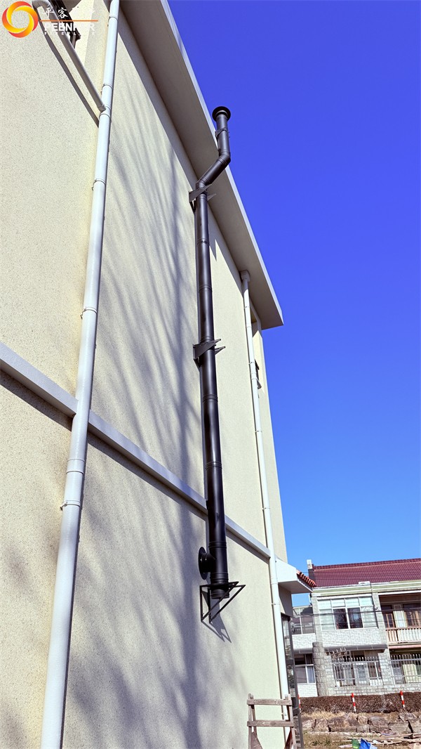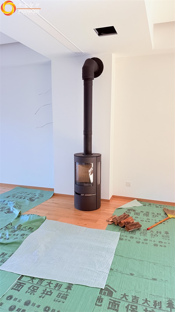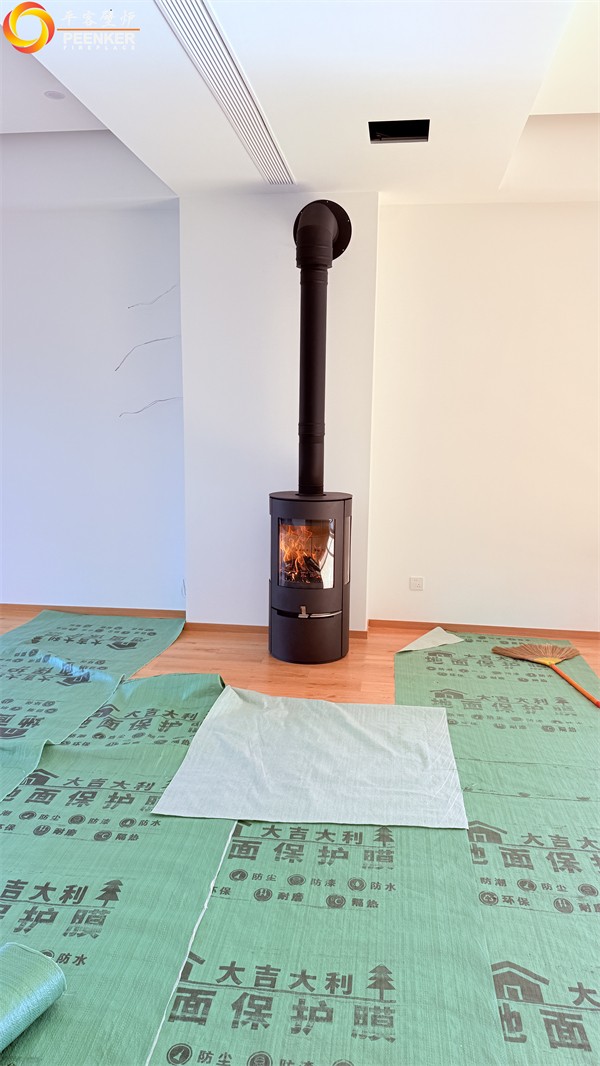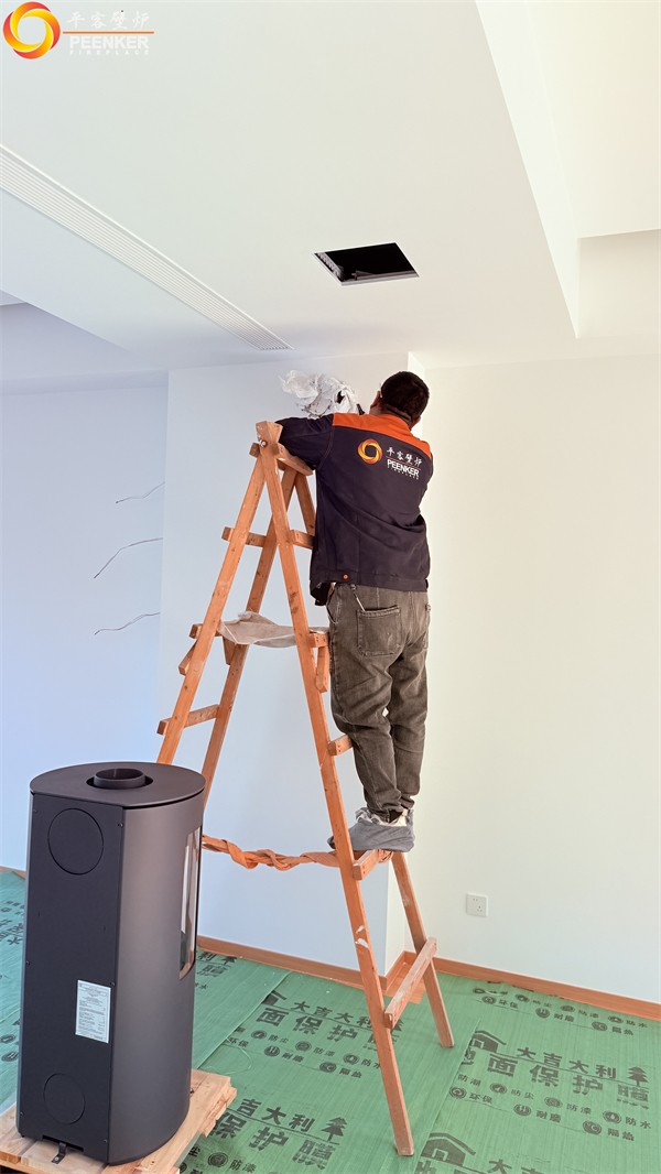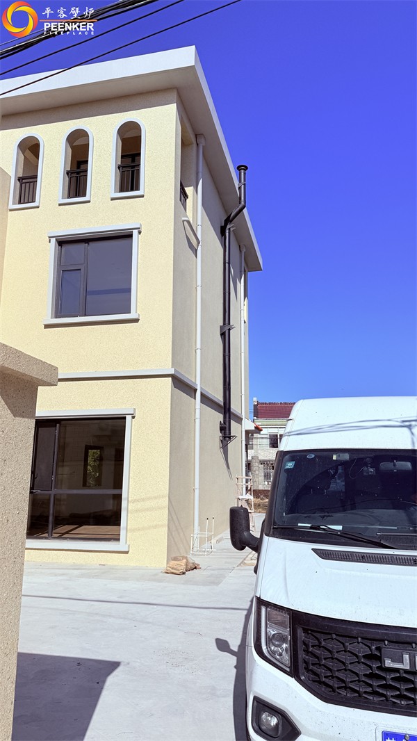 项目情况:该项目位于上海浦东,为自建别墅。壁炉安装在客厅位置,烟囱出侧墙到户外加高过屋檐,由平客项目部带队上门安装。