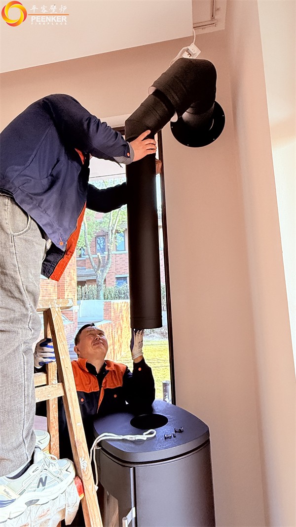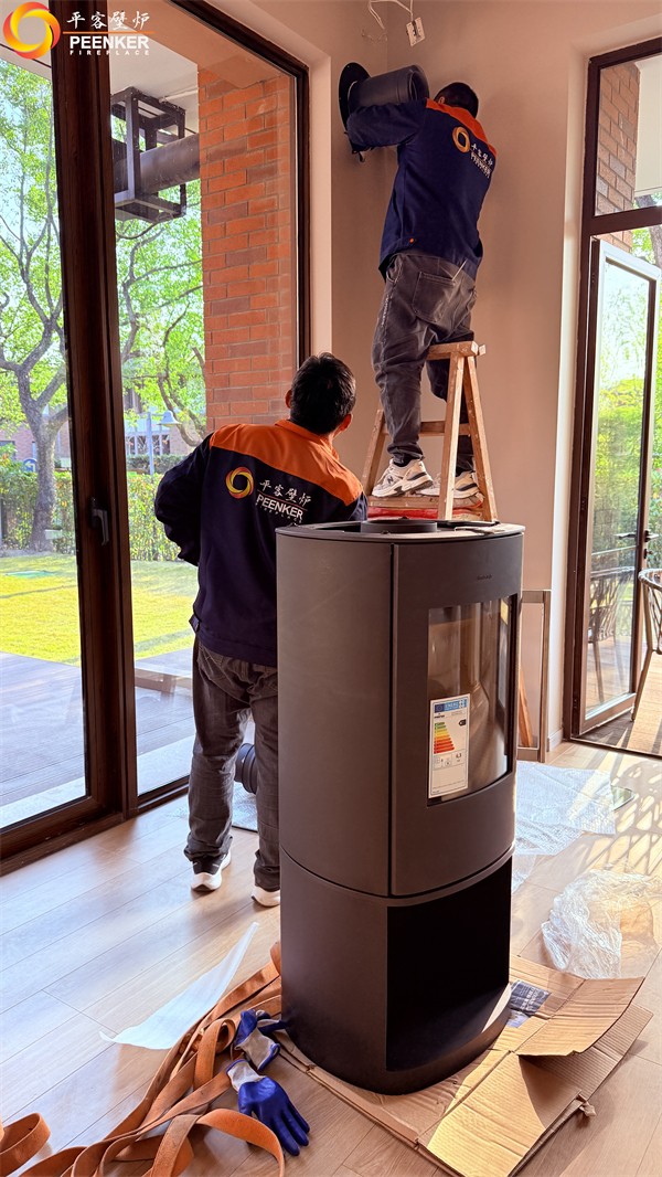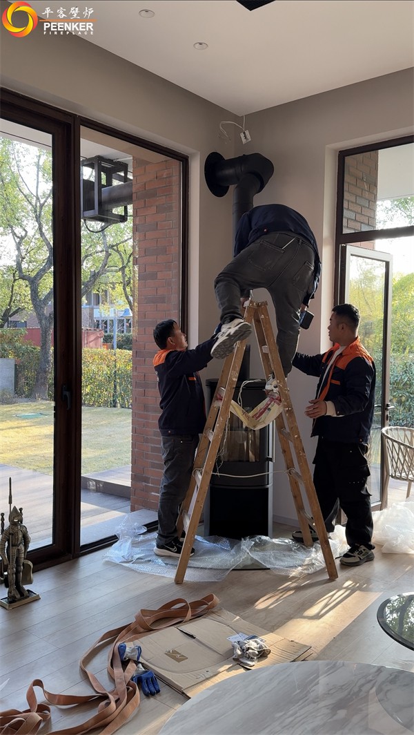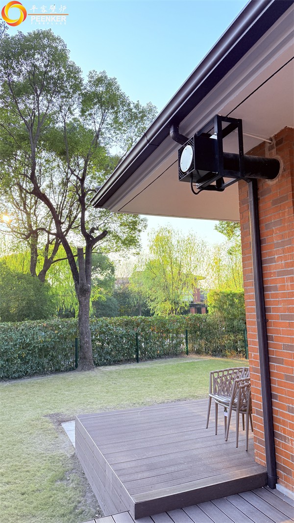 项目情况:该项目位于上海松江,壁炉安装在客厅角落,户外无法安装烟囱,使用壁炉风机代替,由平客项目部带队上门安装。