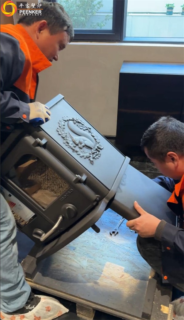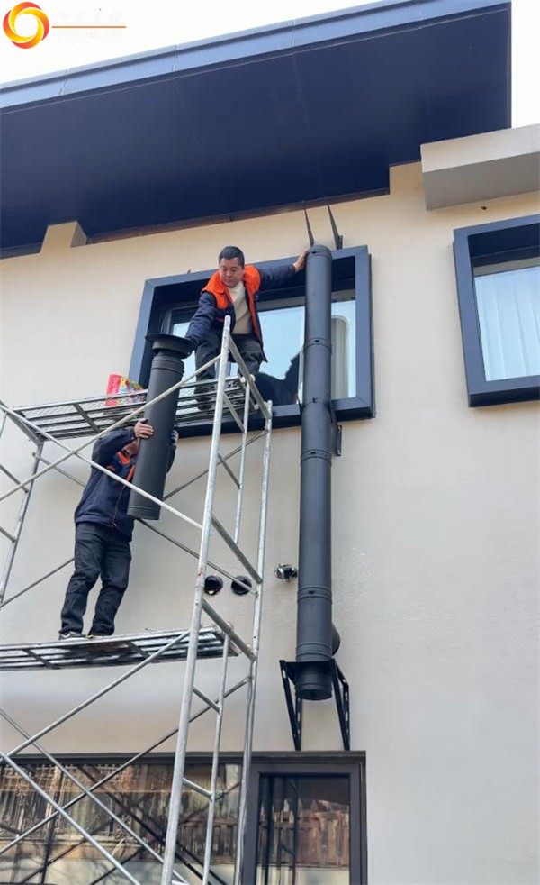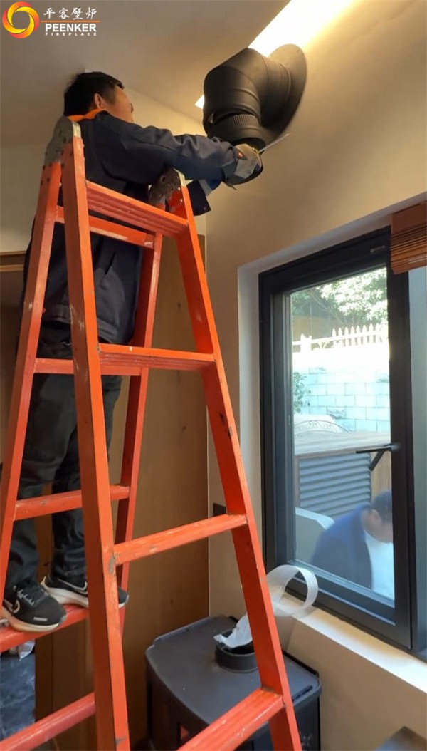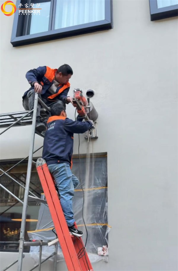 项目情况:该项目位于湖南长沙湘江壹号别墅区,业主复购的第二台真火壁炉,烟囱穿侧墙到户外。由平客项目部带队上门安装。